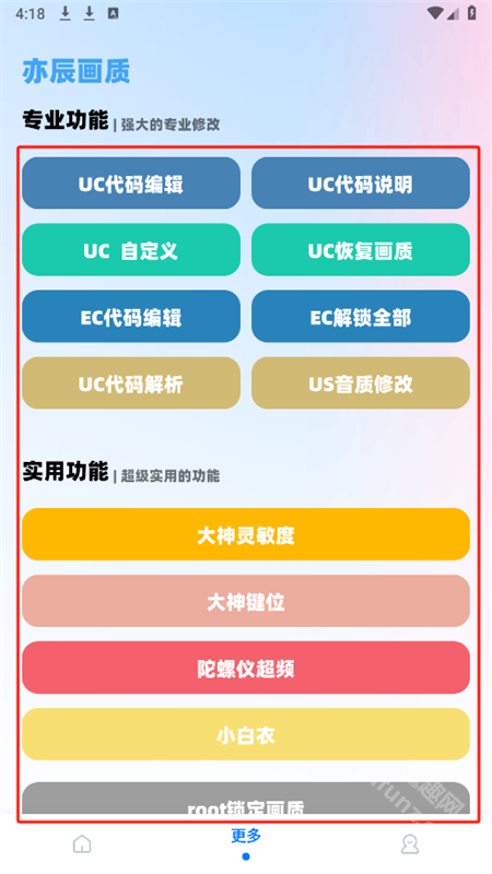 8、在更多页面,可使用UC代码编辑、大神灵敏度、陀螺仪超频等功能。