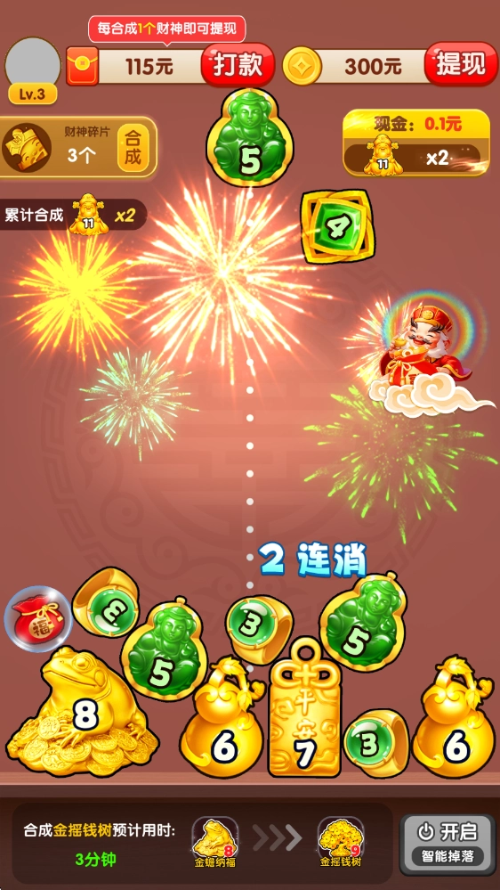 2、借助简单的合成操作,就能持续获取更高级别的物品,而合成出最高级的财神,还能解锁额外奖励。