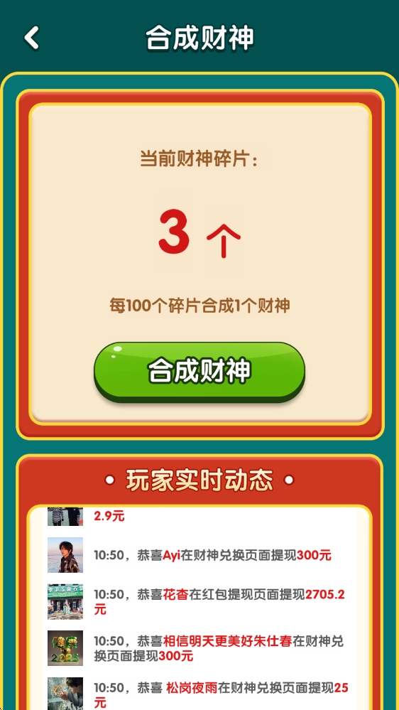 3、合成出来的财神不仅具备收藏价值,还能直接用于兑换各类福利,拥有的数量越多,所能兑换到的奖励也就越丰厚。