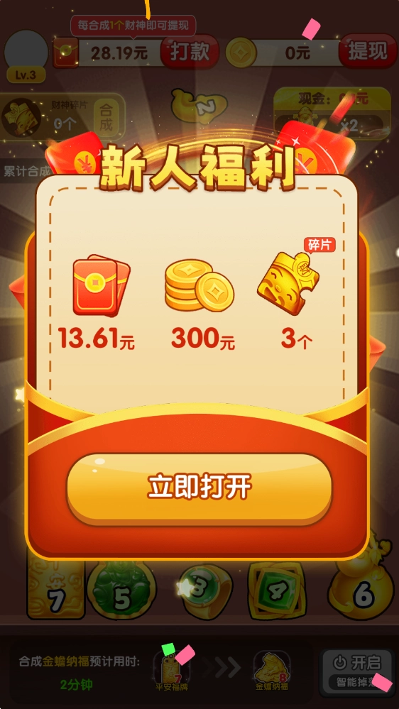 3、新手进入后能轻松合成两个财神,接着就能领取新人奖励了。