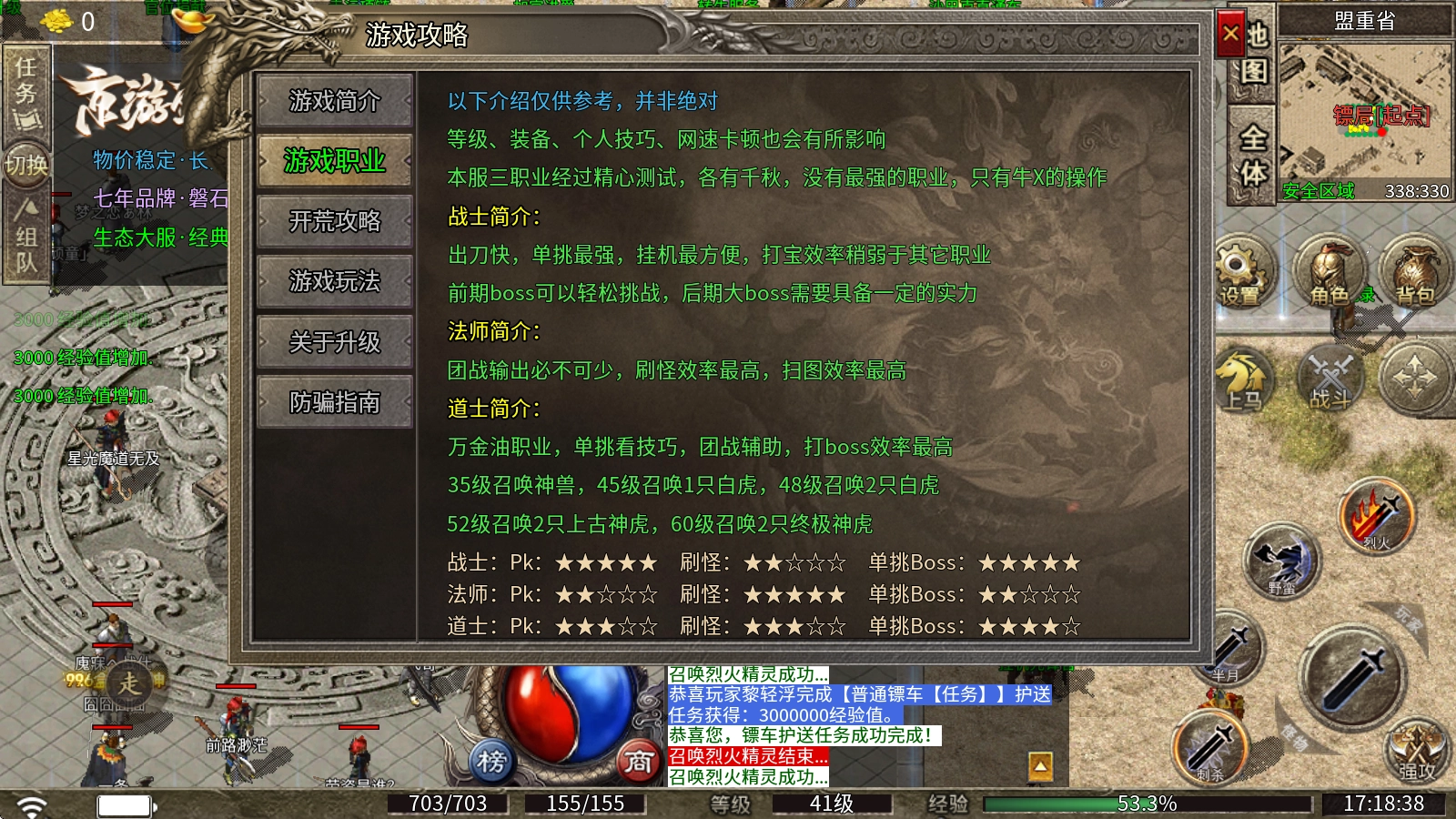 3、道士:这个职业堪称万金油,单挑能力取决于操作技巧,在团战中主要承担辅助角色,而打boss时效率是最高的。等级达到35级可以召唤神兽,45级能召唤1只白虎,48级可召唤2只白虎,52级能召唤2只上古神虎,60级则可以召唤2只终极神虎。