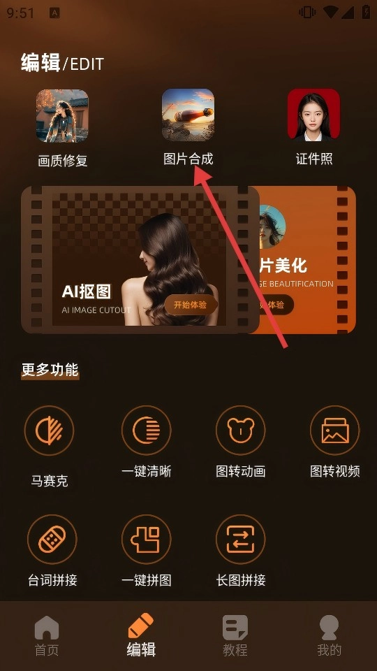 1、打开图片编辑类应用的“编辑”页面,点击【图片合成】选项,即可进入海报设计界面。