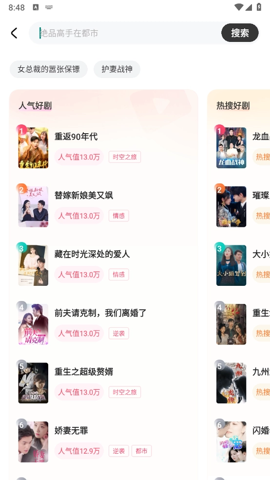 2、打开软件后,首页展示了丰富多样的短剧类型,涵盖逆袭、都市、情感、战神等类别。