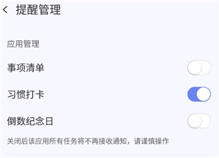 3、进入提醒管理设置页面后,点击“习惯打卡”右侧的圆点按钮,开启该功能。