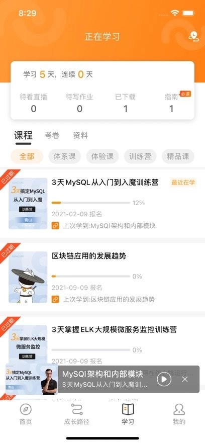 1、用户可以选择跟着课程视频一步步学习,其他学习资料也可以参考查看。
