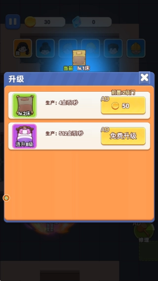4.升级门可以增强防御能力,升级床能够加快金币的产生速度。
