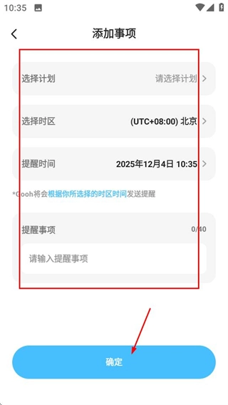 4、进入添加页面,在填写好提醒信息后点击确定按钮,即可完成行程提醒的添加操作。