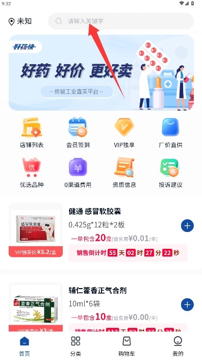 3、在首页商城顶部的搜索栏中输入药品名称或相关关键词,搜索所需药品并进行浏览。