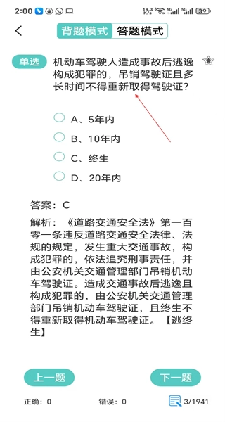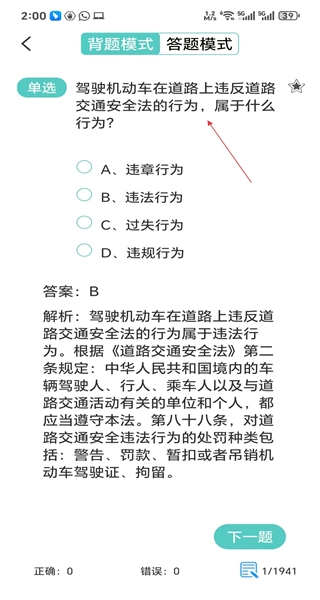 进入练题界面后,会看到单选题及其对应的选项,此时可以查看该题的答案和解析内容,完成当前题目的查看后,点击“下一题”按钮即可继续进行练习。