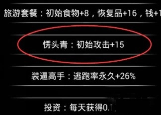 2、点击“新开”后会弹出初始道具套餐选择界面,不同套餐效果各异。我之前玩过一次,系统提示新手建议选第一种,虽然物资给得不少但实用性不高;更推荐大家选第二种,不仅能降低初期死亡率,避免当“愣头青”,还能额外增加15点攻击力。