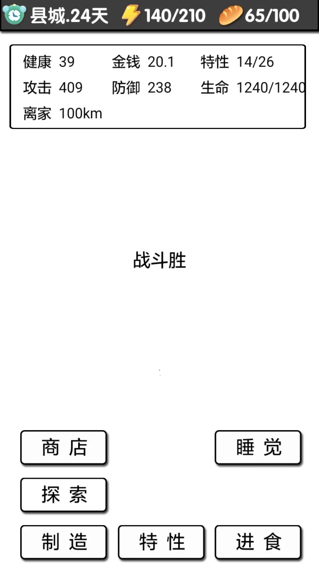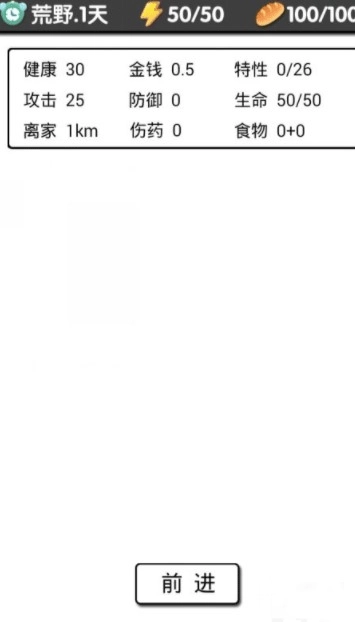 4、选择愣头青,就正式进入游戏了,点击前进,前进和探索都会消耗精力,精力能通过睡觉和喝啤酒恢复(啤酒要等你到县城后才会出现)。