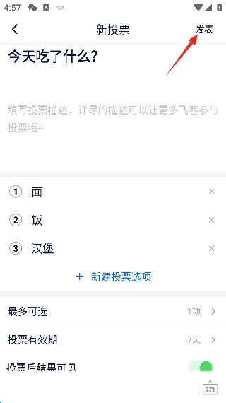 在输入相关内容之后,点击屏幕右上角的“发表”按钮。