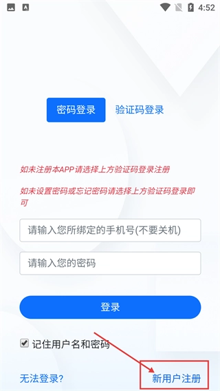 2、进入登录页面后,系统提供【密码登录】与【验证码登录】两种方式;新用户需点击【新用户注册】,即可切换至验证码注册/登录界面。