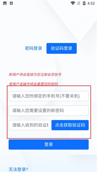 3、进入新用户注册界面后,先输入需绑定的手机号,接着设置新密码,随后点击【获取验证码】并填写收到的验证码,最后点击【登录】按钮,即可完成注册或登录流程。