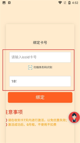 4、进入卡号绑定页面,输入iccid卡号并补充相关信息后,点击【绑定】按钮即可完成卡号绑定操作,在此过程中请留意需在7天内完成激活的相关注意事项。