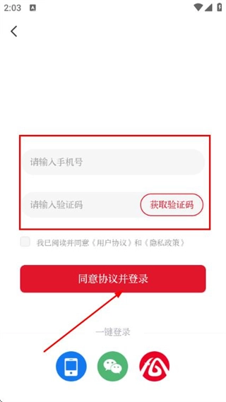 3、在登录页面输入手机号与验证码,勾选相关协议后,点击登录按钮以完成账号登录流程。