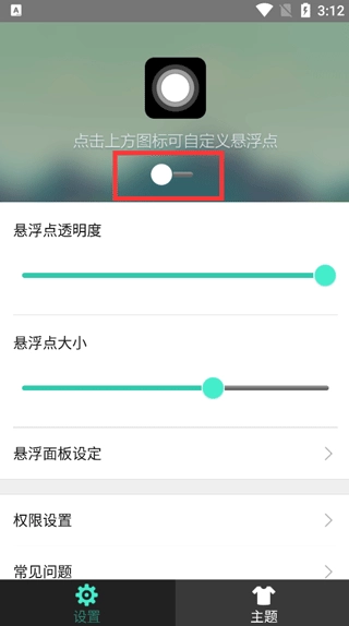 2、在设置页面中,你可以调整悬浮点的透明度与大小;图标下方设有一个按钮,可用于开启或关闭悬浮窗;直接退出应用同样能关闭悬浮点,此外还能为小白点更换主题颜色。