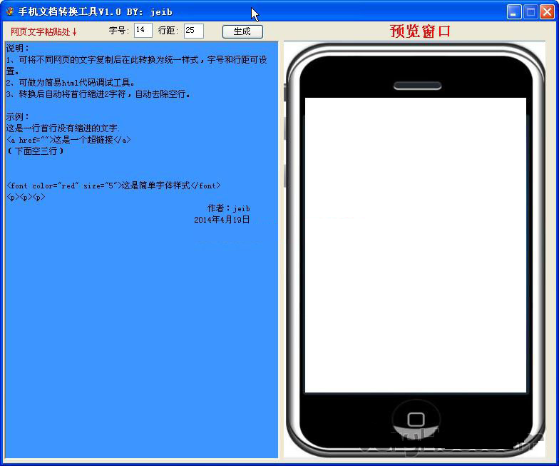 手机文档样式转换器是用于转换手机文档的一款工具。软件页面简洁,操作简单。你只需将需要转换的内容输入,就会自动跳转成网页预览格式,可以预览效果,欢迎下载使用。