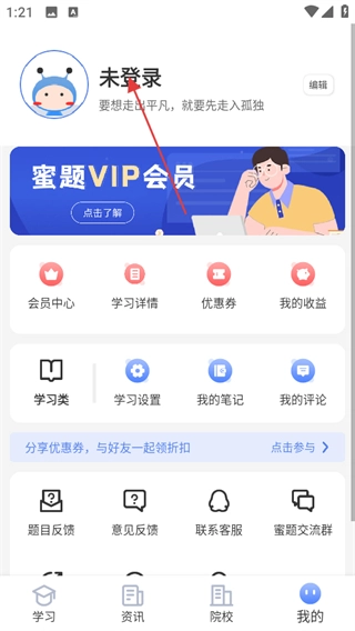 1、打开翻硕百科蜜题APP,在首页点击底部导航栏的“我的”选项,即可进入个人中心页面。