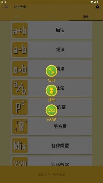 4、游戏模块可通过右上角的齿轮图标调整游戏难度,包含培训、挑战、无尽三种模式,助力用户提升数学公式的计算能力。