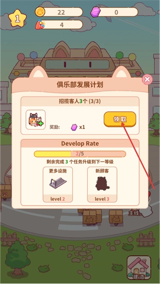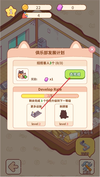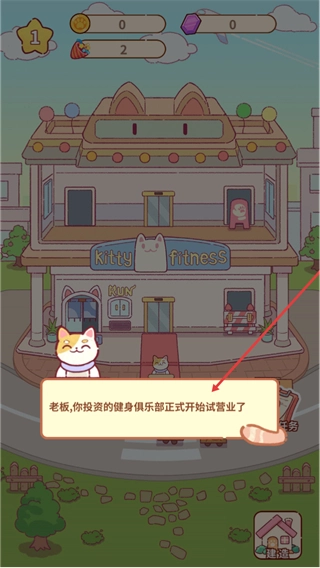 1、这是猫咪健身房的试营业初始界面,查看猫咪的对话提示后,即可进入俱乐部的运营流程。