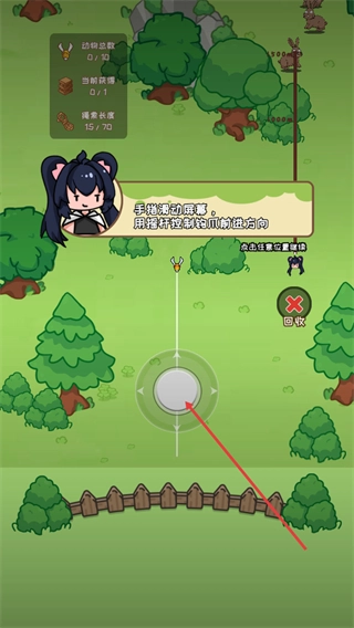 1、根据手指滑动屏幕,用摇杆控制钩爪前进方向的提示,操控摇杆调整钩爪方向,借助钩爪收集动物,同时留意绳索长度的限制。