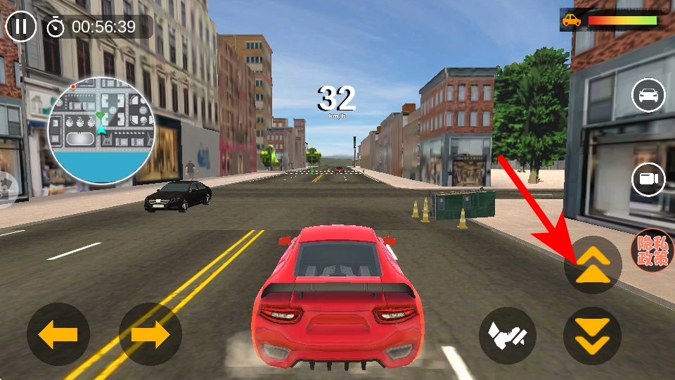 2、游戏中依照箭头指引,点击加速按钮提升车辆速度,朝着任务目标区域前进,注意观察路况避免碰撞。