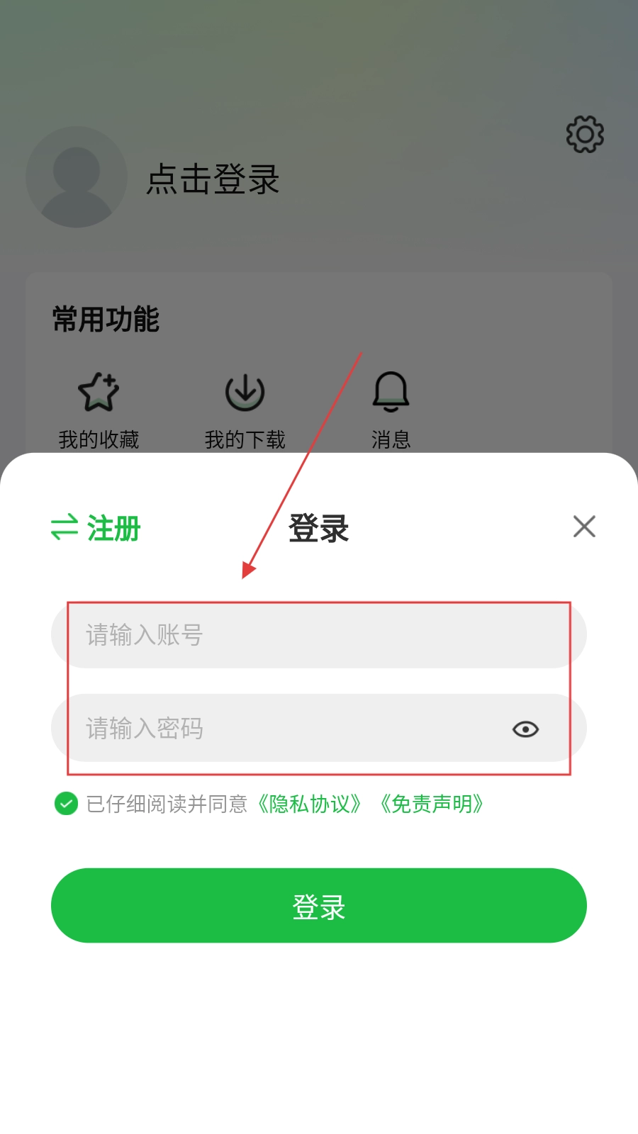 3、在登录弹窗输入【账号和密码并勾选协议】。