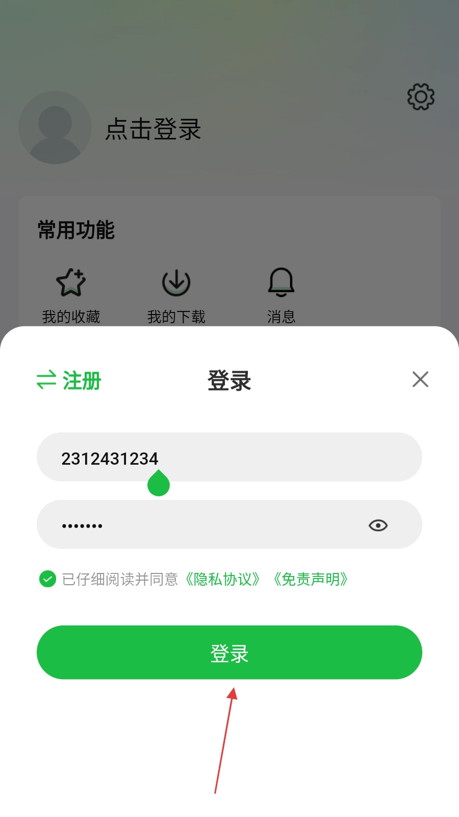 在个人中心页面,点击【点击登录】按钮,会弹出登录弹窗。