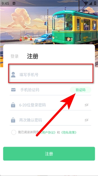 4、设置登录密码并再次确认,勾选用户协议后,点击注册,完成账号注册。