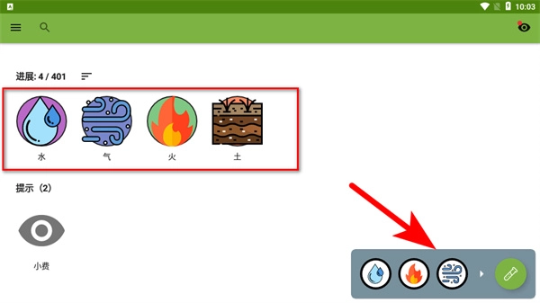 进入游戏界面后,在下方的选择栏里按照箭头的指引选择水、火、气这三种元素,这是合成新元素过程中非常关键的一步操作。