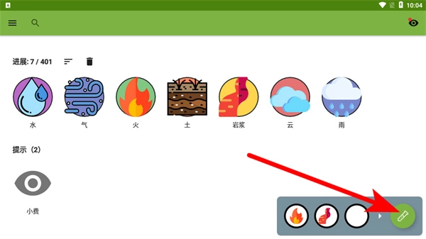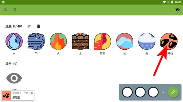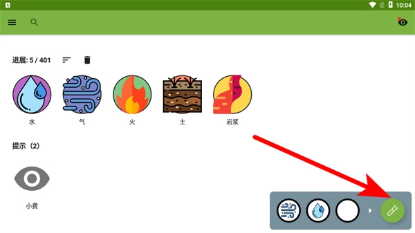 2、游戏里按照箭头的提示,在选择栏中挑选气元素与水元素,合成出全新的岩浆元素,向着解锁更多元素的目标不断迈进。