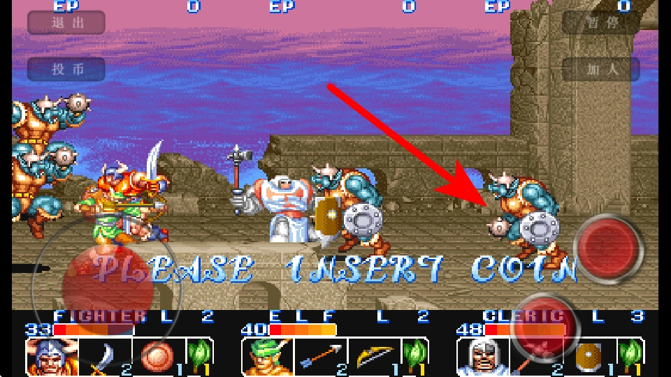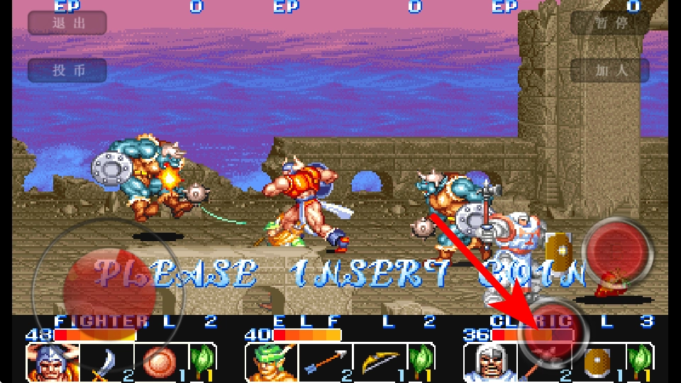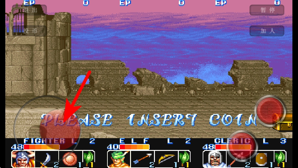1、进入游戏界面后,点击箭头指向的投币按钮,这是开始游戏的关键操作,准确点击才能进入战斗关卡。