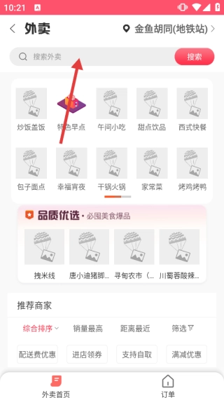 2、在【外卖】页面顶部的搜索框中,输入你想点的外卖相关关键词,然后点击【搜索】按钮即可查找对应的商家。