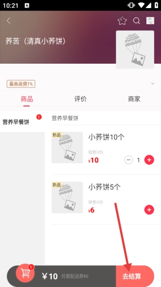 3、挑选好商品添加至购物车后,点击页面底部的【去结算】按钮,即可完成外卖订单的提交流程。
