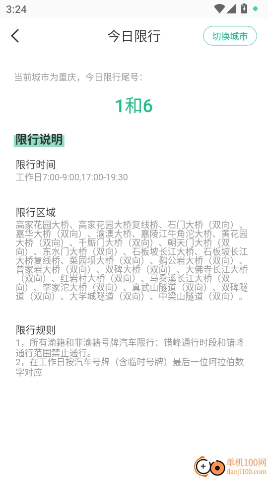 3. 随后进入“今日限行”的详情介绍菜单界面,点击右上角的“切换城市”按钮,即可进入下一步操作。