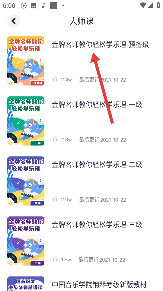 2、在大师课列表里,点击【金牌名师教你轻松学乐理-预备级】就能进入这门课程。