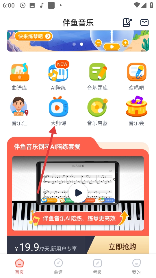 在伴鱼音乐的首页,点击【大师课】选项就能进入大师课板块。