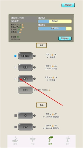 2、在消费页面的住所板块,选择更高级的住,该住所会提供更高的幸福感加成。