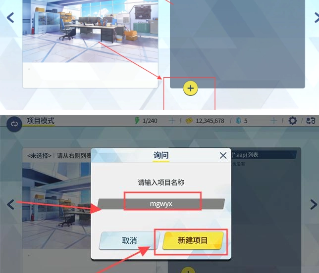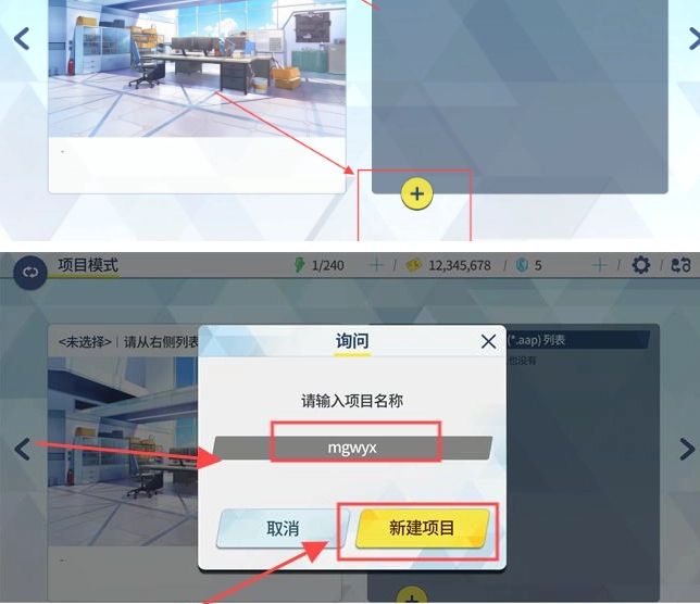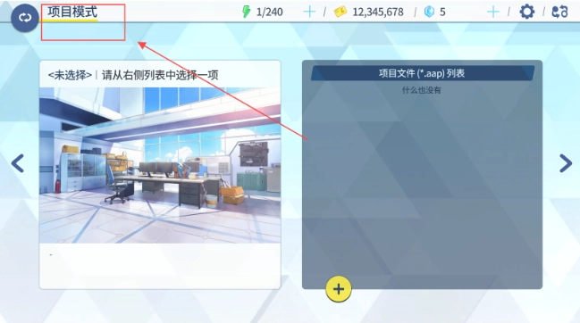 5、接着在项目模式的场景中点击+号,设置一个项目名称