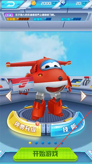 1、当前是乐迪的角色界面,界面展示了其生命值、敏捷性等属性,点击开始游戏可进入游戏,也能通过免费升级、技能按钮强化该角色。