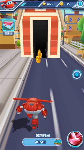 3、当前处于配送流程中,界面显示已送达状态与奔跑距离进度,可借助右侧的技能按钮辅助操作,持续推进关卡的进行。