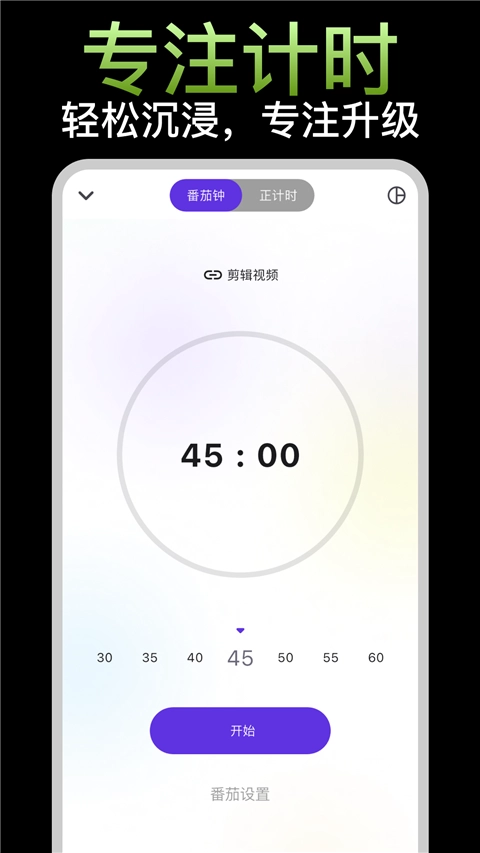 2、专注打造计时工具,涵盖番茄工作法与自定义模式,可生成工作效率报告,助力用户识别高效时段并发现改进空间。