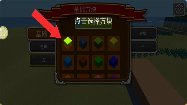 3、打开方块选择界面后,在基础分类下点击目标方块如绿色方块,选定要使用的搭建材料。