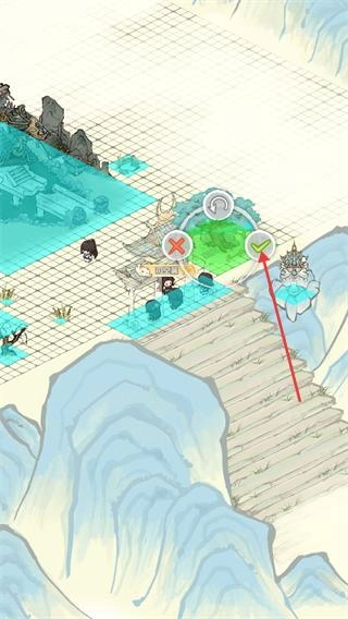 4、进入建筑布局的网格区域,选定合适位置后,点击界面中的对勾按钮,完成灵树的建造位置确认与放置。