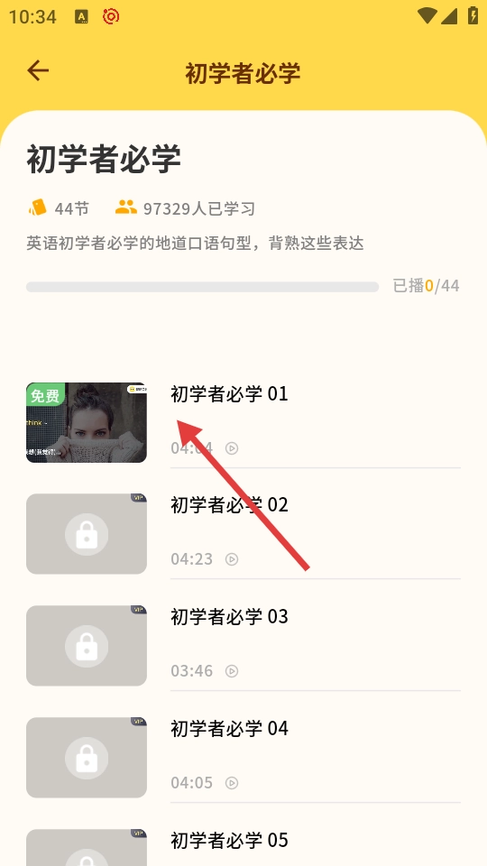 4、在课程详情页面,点击【初学者必学01】,就能开启该节课程的学习。