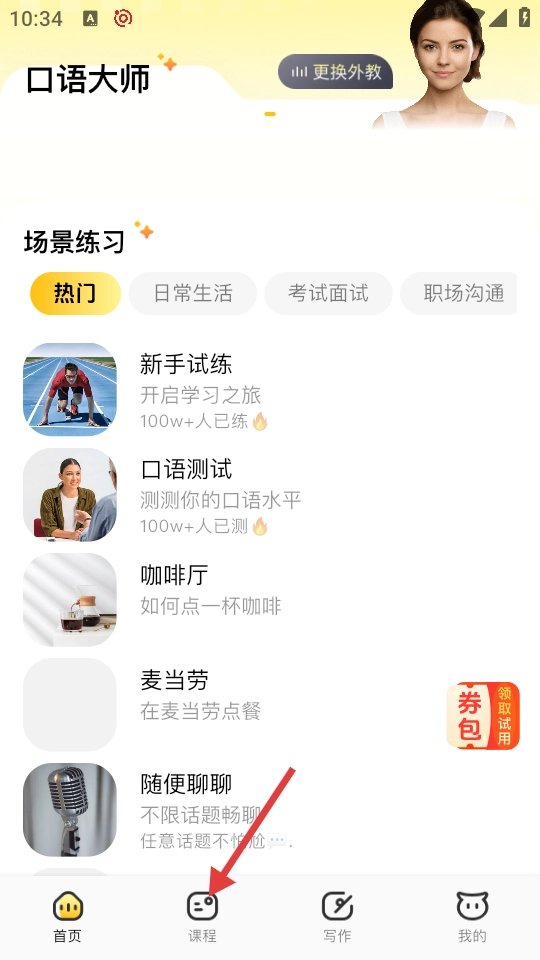 2、在主界面点击底部的【课程】选项,即可进入课程推荐页面,在这里可以查看互动视频课、热门课程等各类内容。