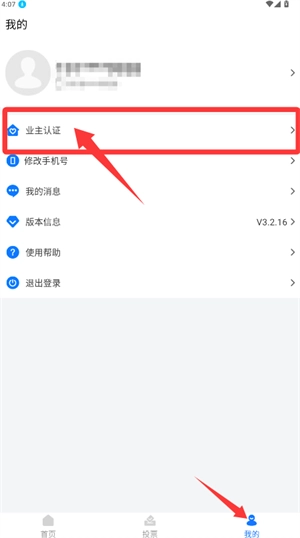 1、在个人中心页面找到并点击业主认证入口,随后进入身份验证流程。