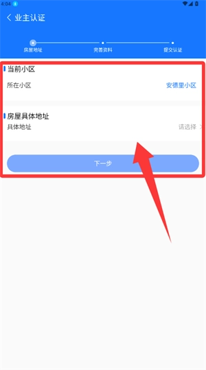 2、进入地址填写页面后,先选定所居住的小区,再补充完整详细的门牌号信息。