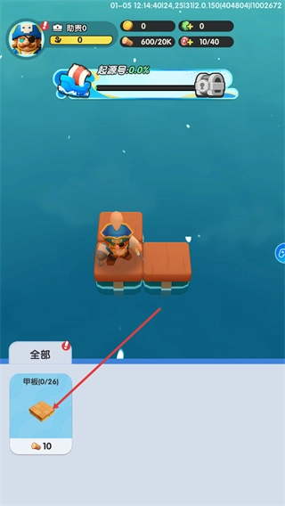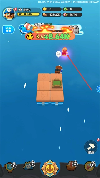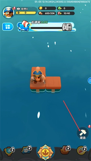 1、点击界面右下角的建造按钮,触发建造操作,利用现有资源扩展当前的木板区域,提升起源号的建设进度。